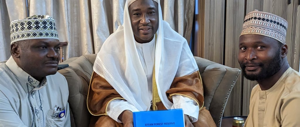 Our team led by the Local Engagement Officer, Mallam Abdullahi Abubakar and supported by the highly respected leader and scholar, Dr Ndanusa Manzuma, met the Honourable Commissioner of Environment, Nafisat Buge, in her office to deliver a collaborative letter requesting support on how to revive the Effon Forest Reserve to achieve its ecological objectives. The objectives include Raising Awareness of Forest Conservation by educating local communities and stakeholders on forest conservation’s ecological and economic benefits and the reversal of land degradation and deforestation through restoring degraded lands and mitigating the impact of deforestation in line with the ministry's regreening goals.