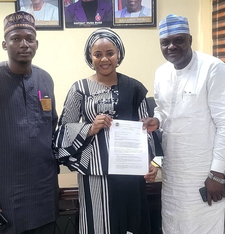Honourable Commissoner of Environment, Nafisat Buge receiving SAVCLIM_AFRICA letter from Dr Ndanusa Manzuma at her office.
